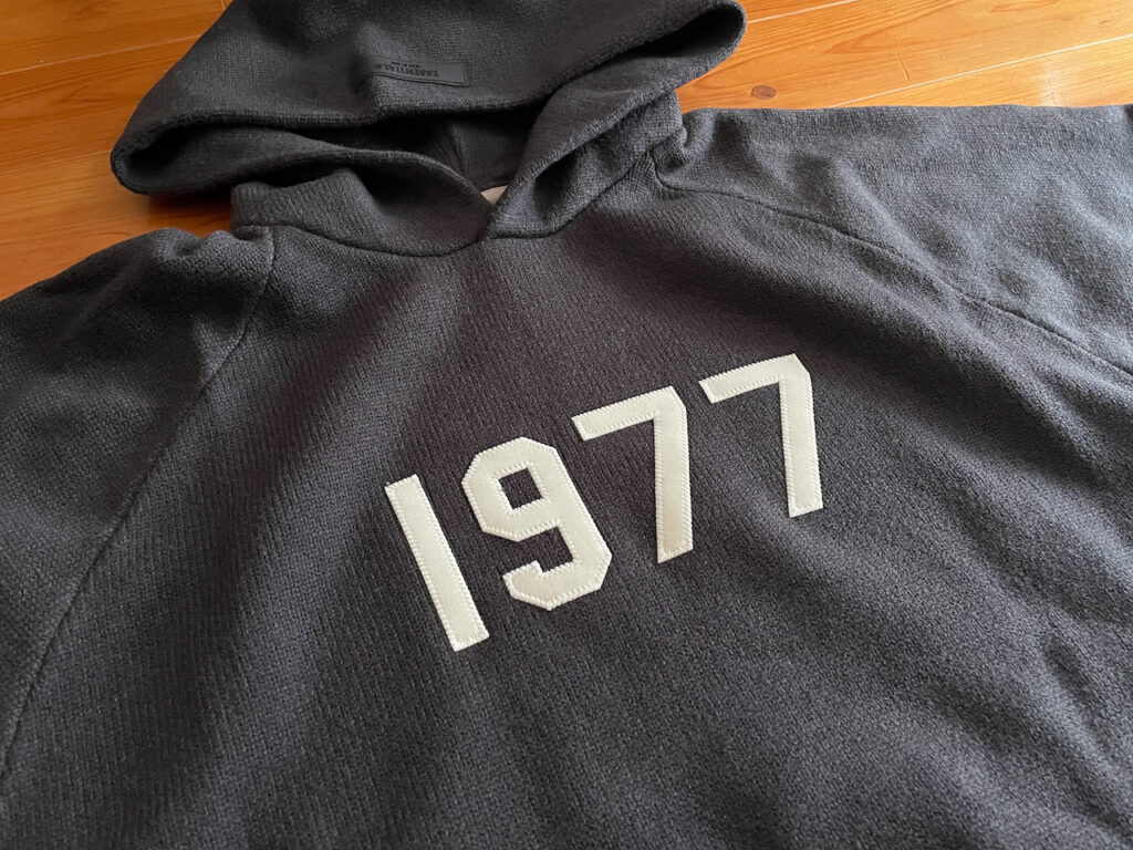 右腿には入っている1977の周りはニットフーディーと違って縫っておらす、そのまま貼り付けている仕様でした。