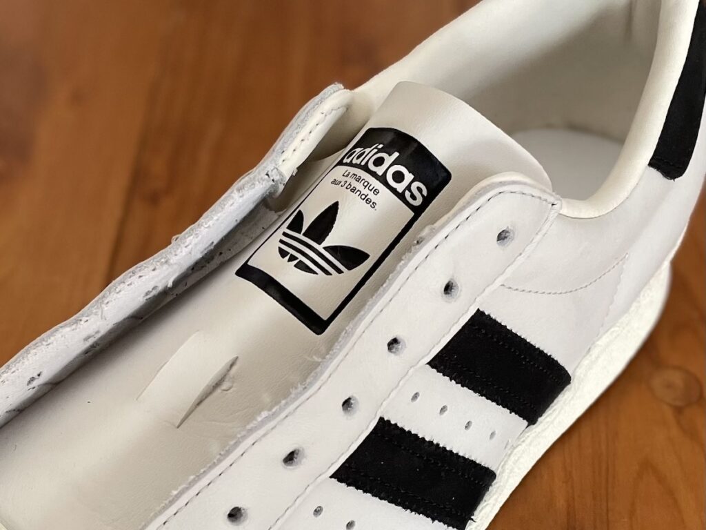 ヒールタブのトレフォイルロゴ、サイドの3本ラインの側にある「SUPER